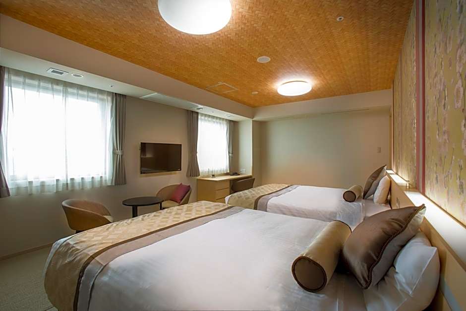 This is a twin room equipped with an electric kettle, television, and air conditioning. For each adult, two children under 12 years old stay for free. Please note that bedding and towels for children sharing the bed are not provided. The bed size is 43 in wide by 77 in long for two beds.